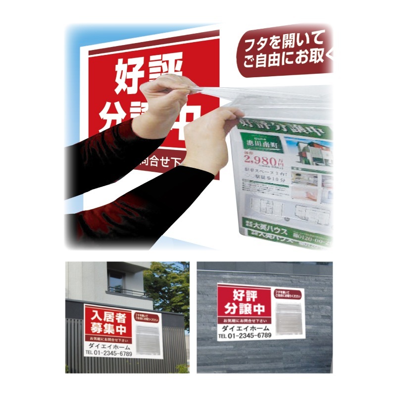 特に、賃貸物件の募集には必須のアイテム。チラシケースが付属しているため、積極的に情報を提供できます。物件詳細や連絡先をすぐに手に取って確認できるので、興味を持たれた方を逃しません。