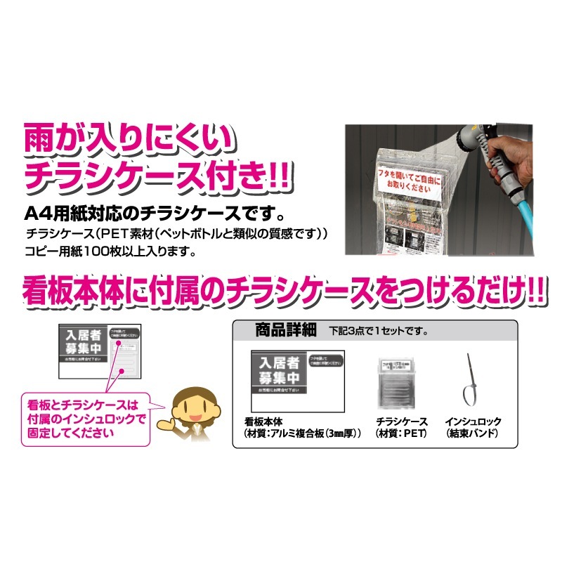 | 材質 | 看板:アルミ複合板(3mm) チラシケース:PET素材 |
