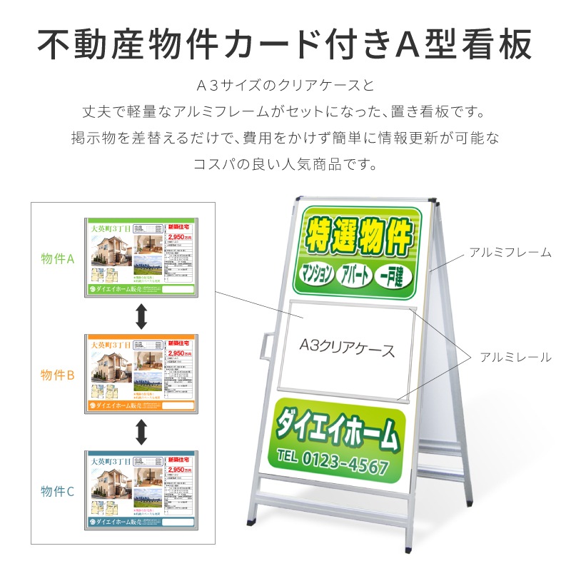 A型看板と物件案内ケースが一体になった「特選物件」AKC-G-08は、爽やかな緑色が目を引く逸品です。このアイテムは、物件カードを美しく飾りながら、より効果的に物件を紹介することができます。A3サイズのガラス窓付きケースは、室内外どちらでも設置可能で、大きさも適度なので存在感がありつつ場所を取りません。