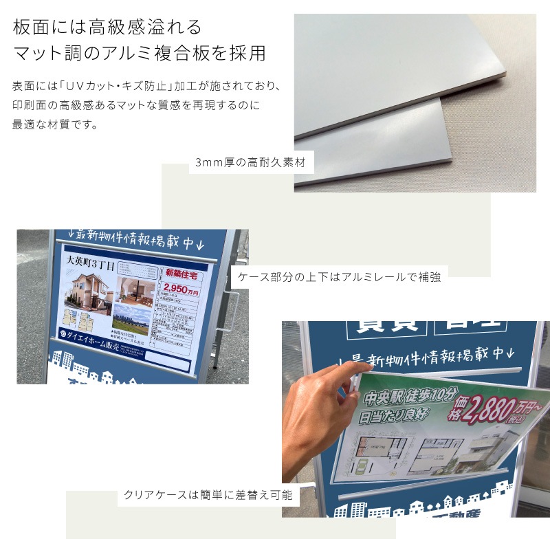 ※耐候性に優れたA型看板は不動産物件案内に最適です。屋内外問わず使用可能で、様々な場面で活躍します。