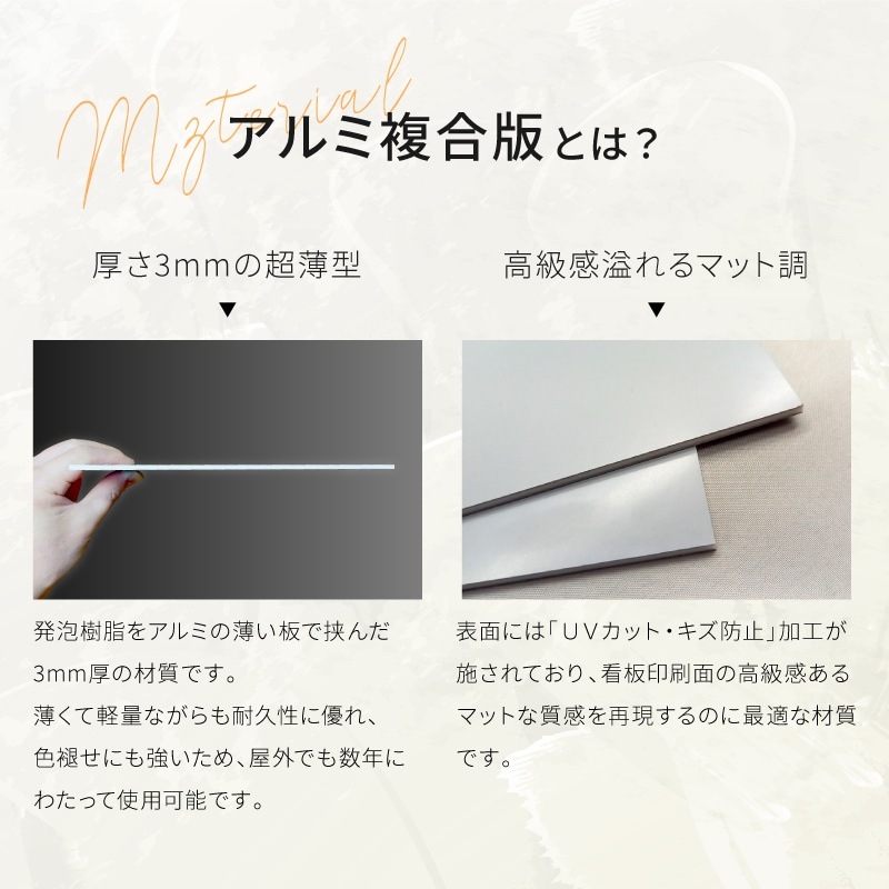 | 備考 | ・標準仕様はアルミ複合板のみでのお届けです。オプションで「背面木枠付き」への変更が可能です。 ・看板を設置する角材・鉄パイプ・足・杭等は付属しておりません。 ・「バース・間取り図・仕様」などの写真や素材はAdobe Illustratorで編集可能なデータをお送りください。 ・元のデザインベースから大幅な変更が必要な場合、別途デザイン調整費(16,500円~)がかかります。 |
