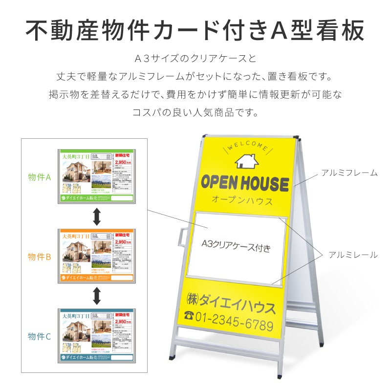 A型看板と物件案内ケースが一体になった「オープンハウス」AKC-G-20が登場しました!黄色の明るい色合いと家のイラストが目を引くデザインで、不動産の店舗やイベントに最適です。A3サイズの案内用ポスターも入れられるので、情報を効果的に伝えることができます。屋外でも使用可能な防水仕様で、長期間のご利用にも安心です。